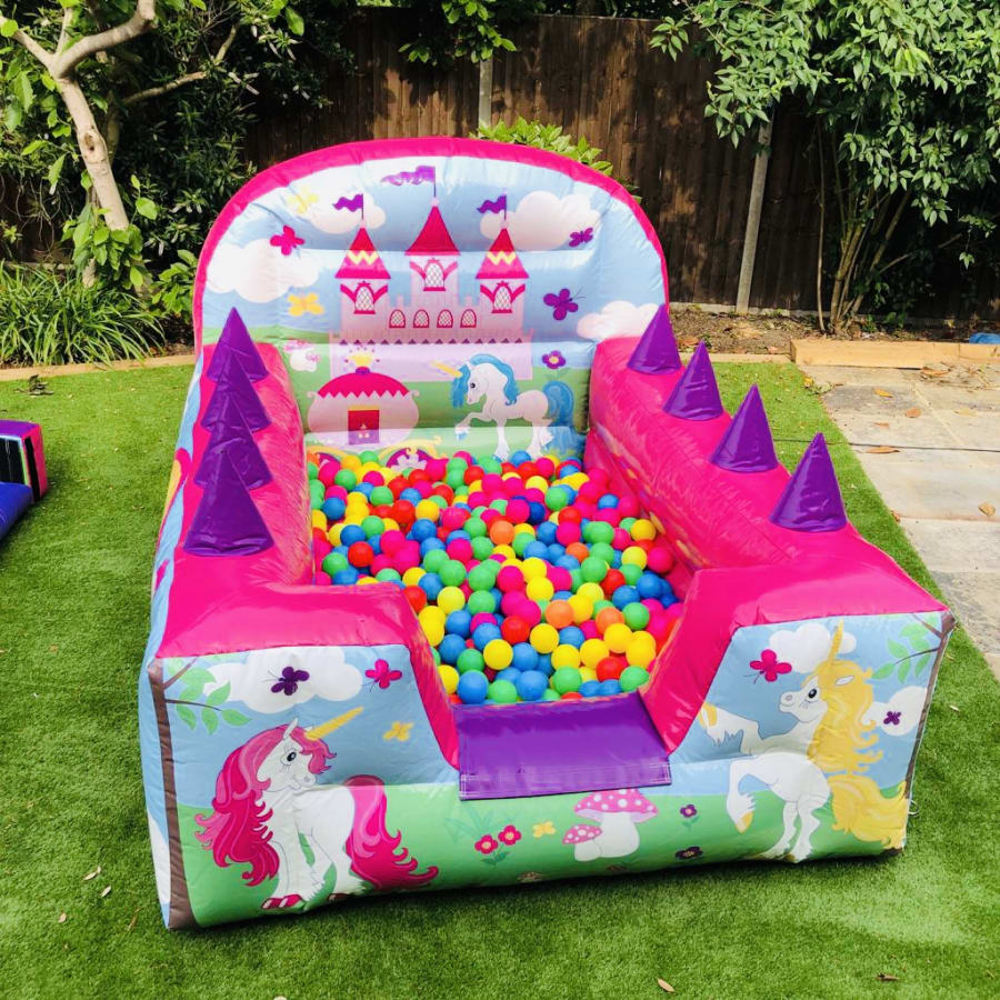 - Unicorn air juggler measuring 6ft W x 8ft L x 4ft H including 1000 play balls. (Small returnable deposit is taken on delivery for the balls)