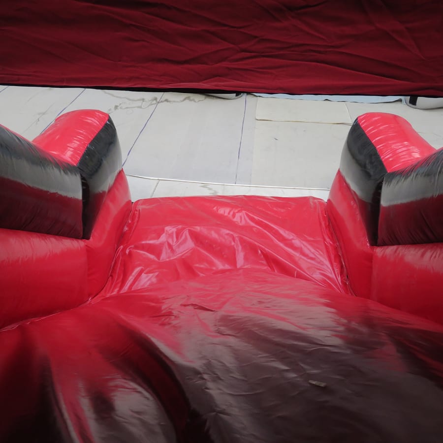 2. Green and black mega 12ft platform slide measuring 16ft W x 25ft L x 20ft H. A standout item that can been seen from afar at any event it is built to European regulations BS EN 14960 and has great features such as firm steps, hand rails and a netted roof.