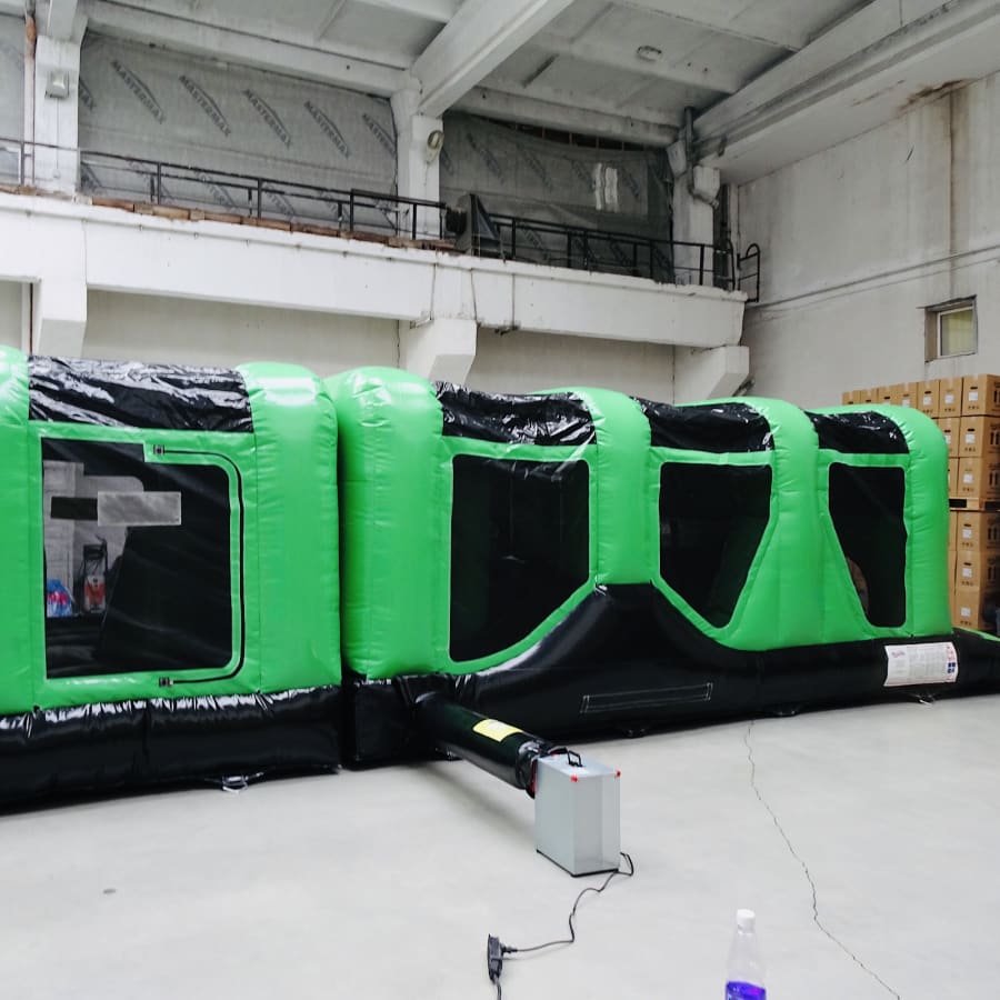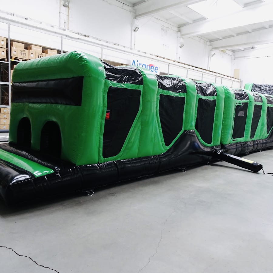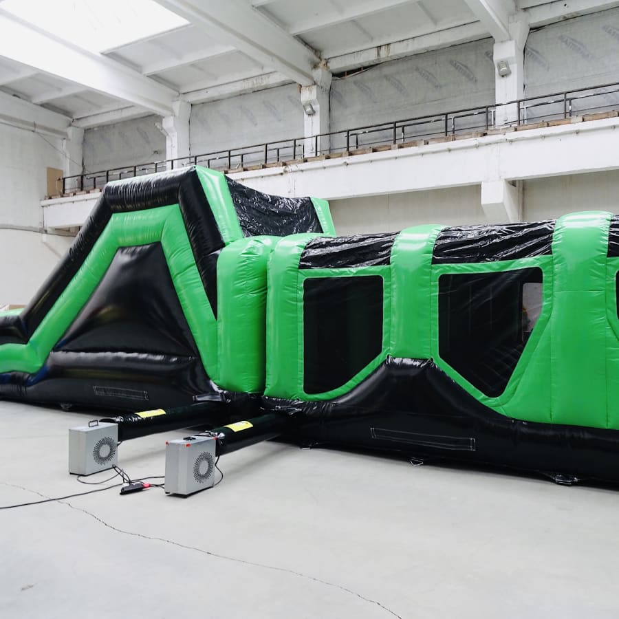 1. The 70ft endurance zone obstacle course. 12ft W x 70ft L x 12ft H, a longer challenging assault course with the following layout: Crawl through > Mangle > Letterbox > Mangle > Pop-up Jungle > Ladder Climb > Slide. Mats are provided on exit for landing.This item requires 3 blowers and will need respective access to electrical sockets. A fully enclosed assault course that provided hours of fun!