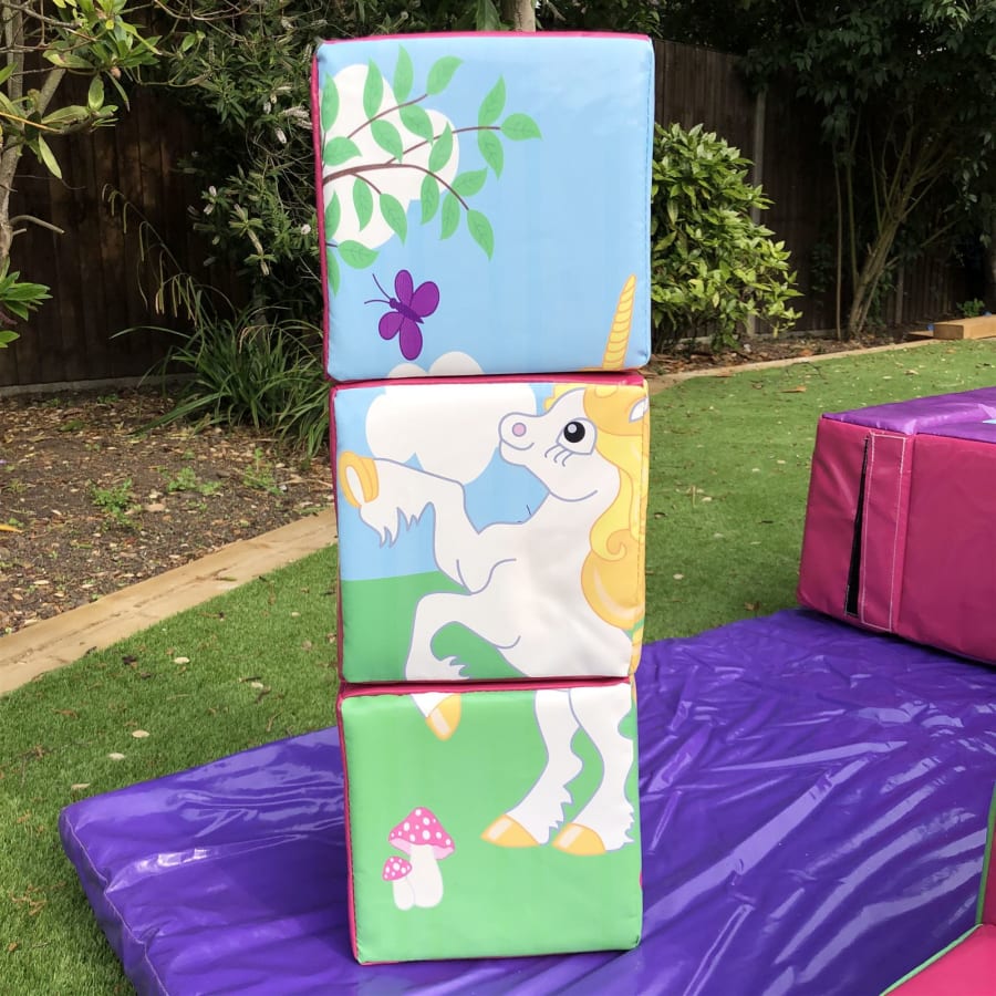- 18 pieces of Unicorn themed soft play comprising of triangles, slopes, squares, steps, puzzle cubes and stepping stones.