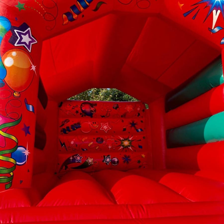 Here we have this premium adult bouncy castle in a celebration party theme on a red base. Although built to withstand the weight of adult users the inflatable makes a good choice for family events so everybody can join in the fun.