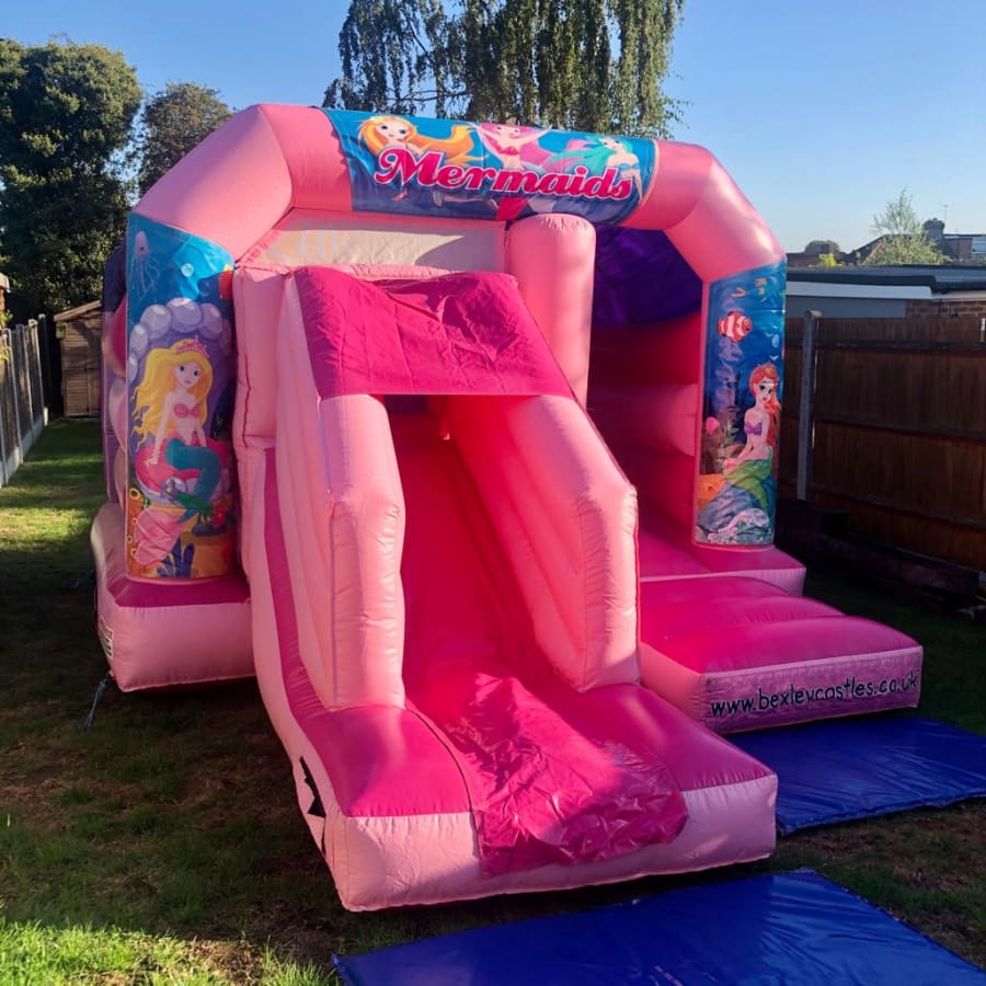 bouncy castle hire Mermaids Pink Bounce N Slide 13ft x 18ft x 10ft in Bexley — Bright. Safe. Party-ready. This mermaid-themed bounce and slide combo brings colour and fun to birthday parties, school events and family gatherings. Designed for children aged 12 and under. Built-in shower or sun cover for weather-safe play. โ๏ธโ