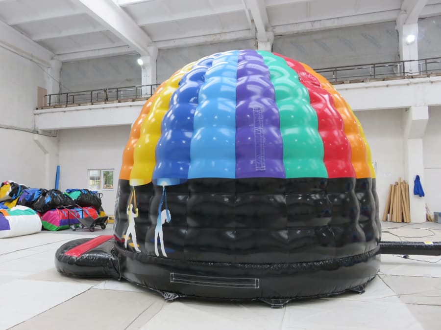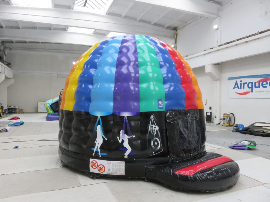 Disco Dome hire combining large bouncing area with speakers and flashing disco lights.