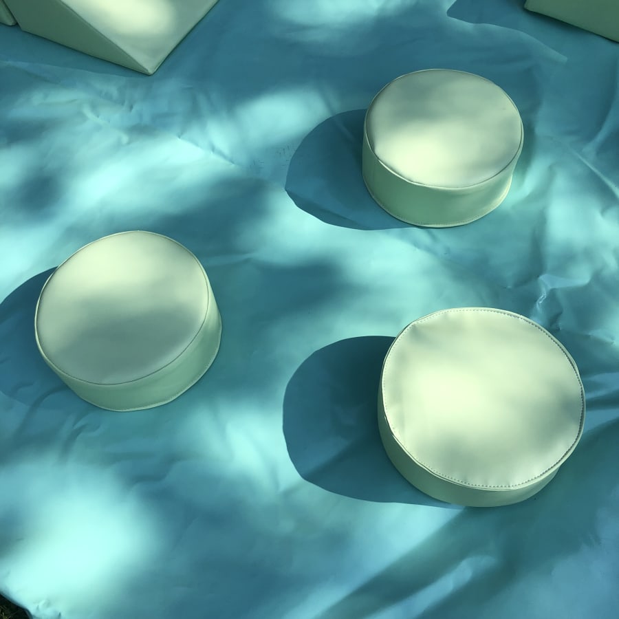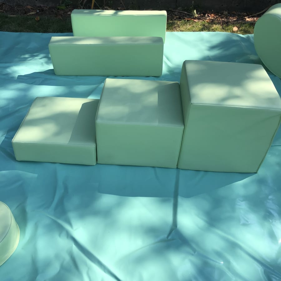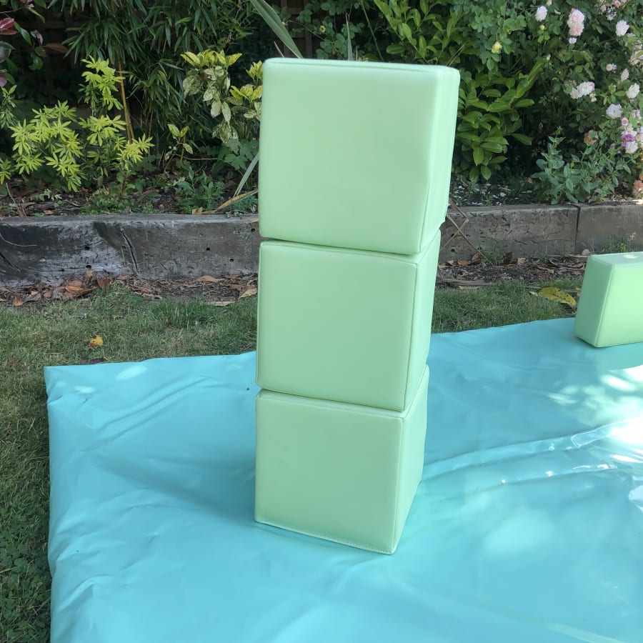 - 18 pieces of pastel mint soft play comprising of triangles, slopes, squares, steps, puzzle cubes and stepping stones.