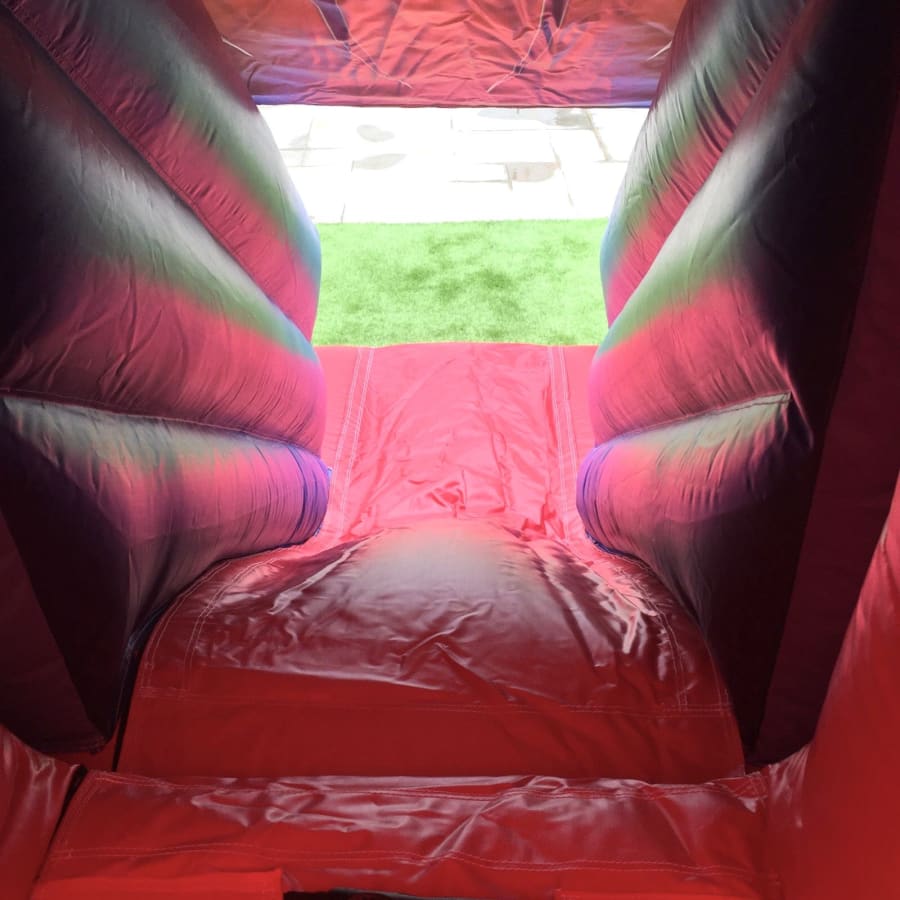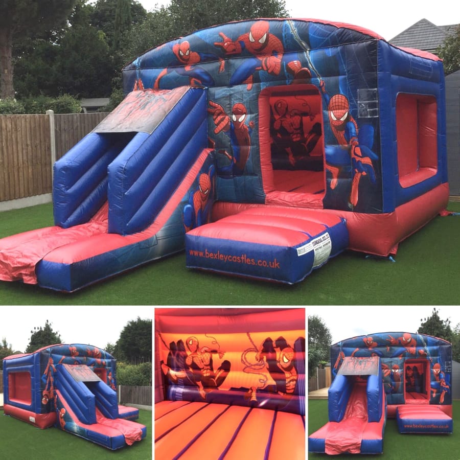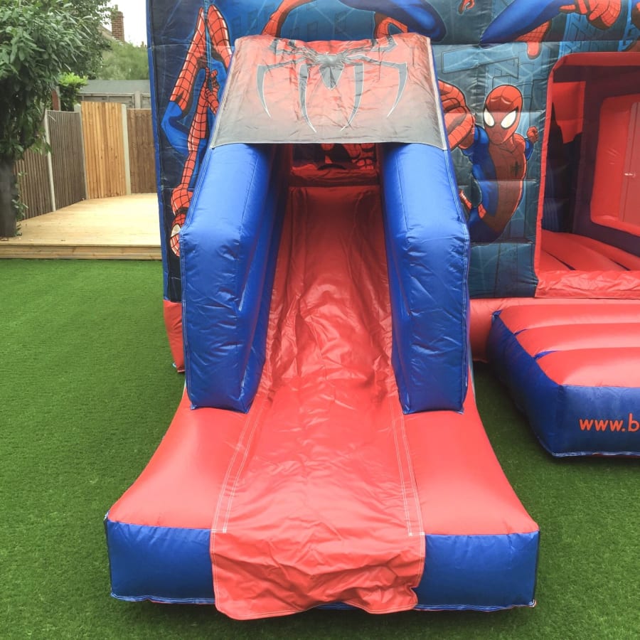 An all in one bouncy castle with 5ft platform slide. This superhero inspired inflatable comes complete with deluxe Spiderman artwork. There are viewing windows on both sides for compete supervision and a sewn in shower cover to create an enclosed bouncing area. Users are assisted by foam steps and a handle when climbing the line and there is a safety mat for exit. This unit is recommended for children up to 11 years of age and is suitable for indoor hire due to its fairly low height of 10ft.