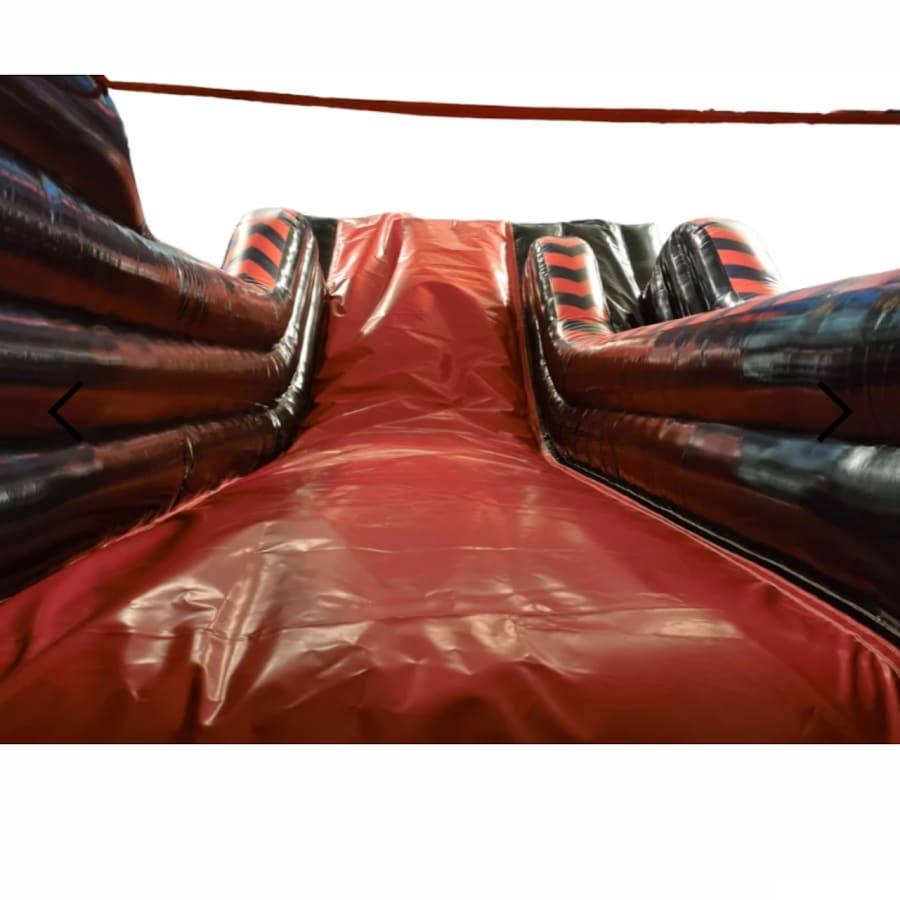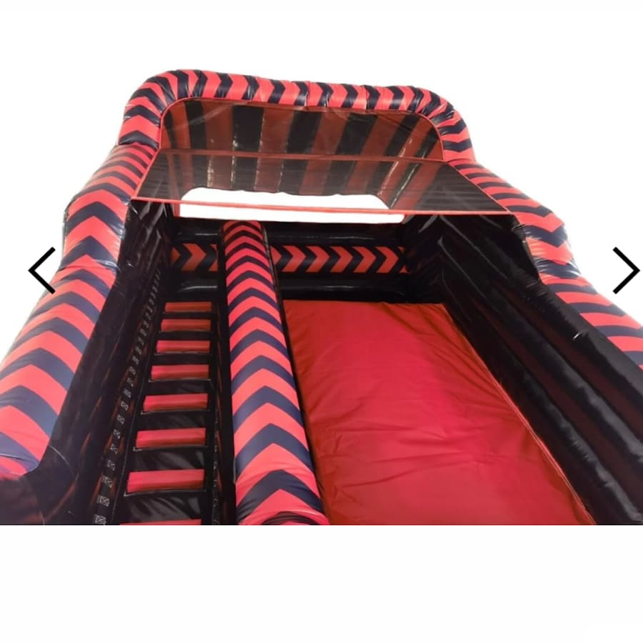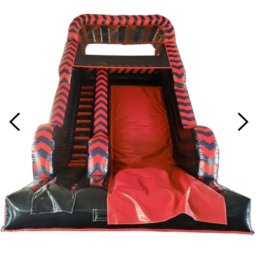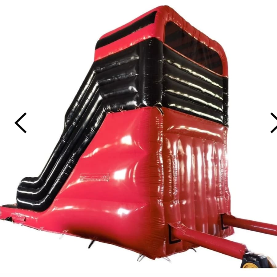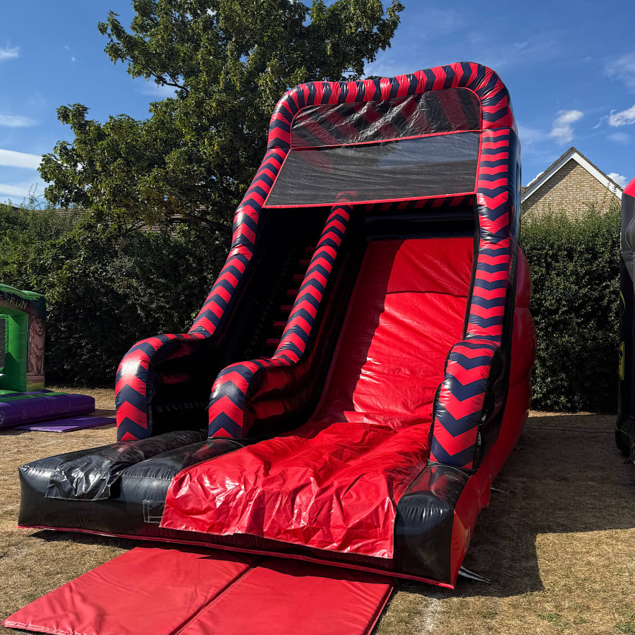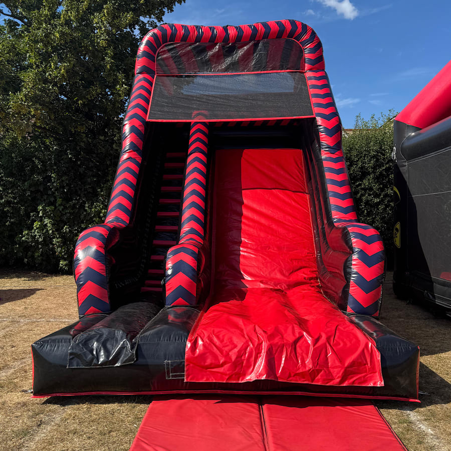 A fantastic red and black colour coded bouncy slide made to the highest standards incorporating all the required safety requirements under BS EN 14960:2013.