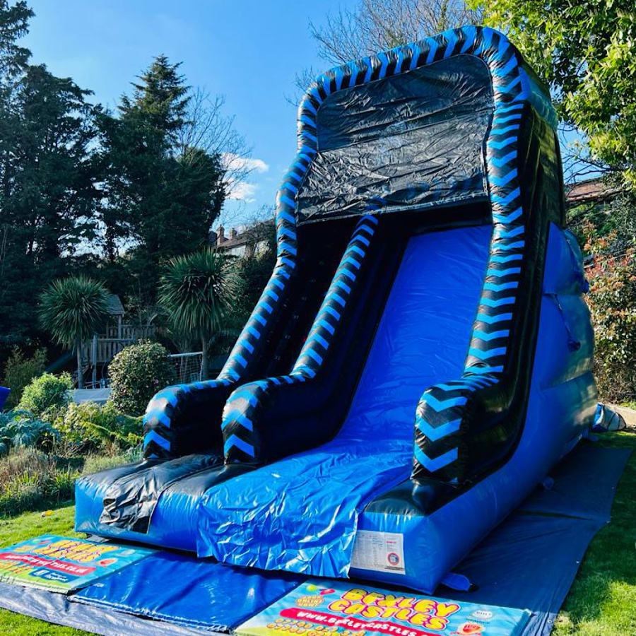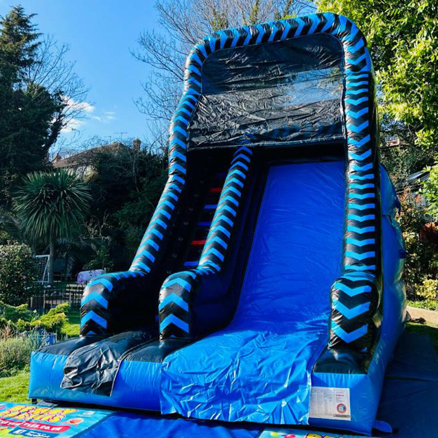 Hire 10ft Platform Slide BLUE in Bexleyheath - Erith - Chislehurst - Greenhithe - Sidcup - New Eltham. The Large Kids 10ft platform slide delivers show-stopping thrills. This blue and black inflatable measures 13ft W x 20ft L x 19ft H and features a 10ft platform slide built to BS EN 14960:2013 standards and PIPA tagged 5982. Safe. Sturdy. Spectacular. π