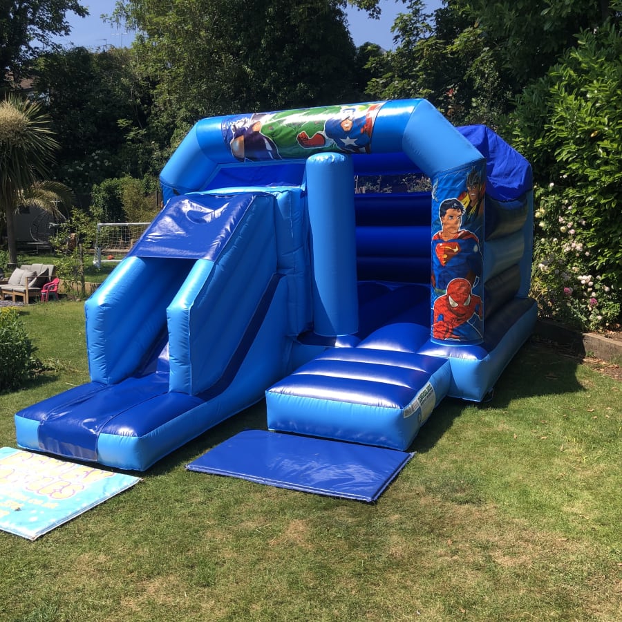 Superhero themed bouncy castles are very popular and often paired with matching themed inflatables and soft play for fantastic package options. Bounce and slides are a great choice, ideal for a variety of party events this unit combines a 5ft front slide with slip sheet whilst offering a large bouncing area. Bexley castles is very serious on safety and this inflatable is packed with features such as netted front and back walls, a sewn in cover and mats to the front for when users exit the slide.