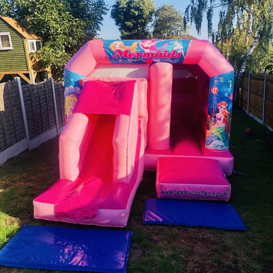 bouncy castle hire Mermaids Pink Bounce N Slide 13ft x 18ft x 10ft in Bexley — Bright. Safe. Party-ready. This mermaid-themed bounce and slide combo brings colour and fun to birthday parties, school events and family gatherings. Designed for children aged 12 and under. Built-in shower or sun cover for weather-safe play. โ๏ธโ