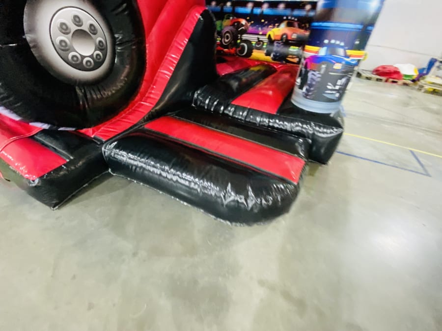 This is a unique 3D Monster Truck design coupled with a Bounce N Slide. Suitable for kids up to 11 years of age this inflatable is entered from the front, inside you will find a great bouncy area with themed artwork across the back wall and sewn in shower cover. Foam steps, along with a handle, assist users up to the top of the slide and then zooooom down the slide and land safely on the mats provided.
