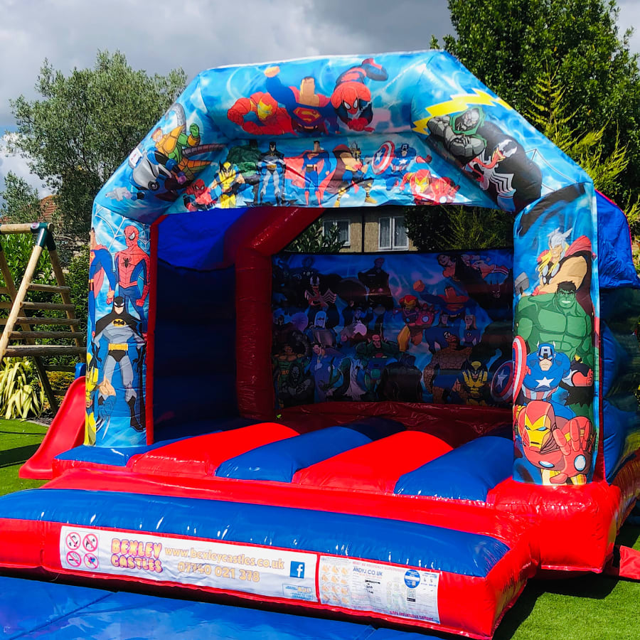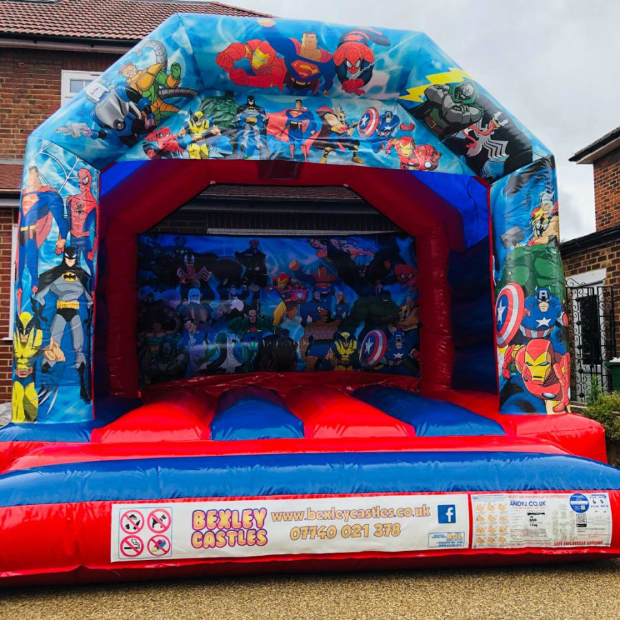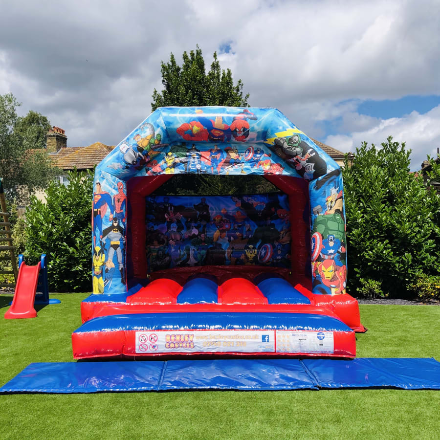 bouncy castle hire Superhero Bouncy Castle 12ft x 12ft x 10ft in Dartford, Bromley, Bexleyheath — Packed with Marvel heroes and bright artwork, this 12ft x 12ft x 10ft inflatable delivers big fun for kids up to 11 years. 🦸♂️🎉 Fast setup. Safe design. Perfect for superhero parties.