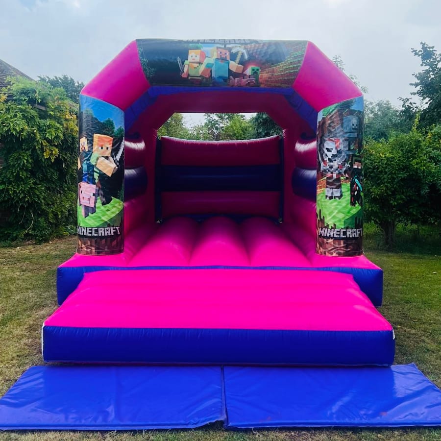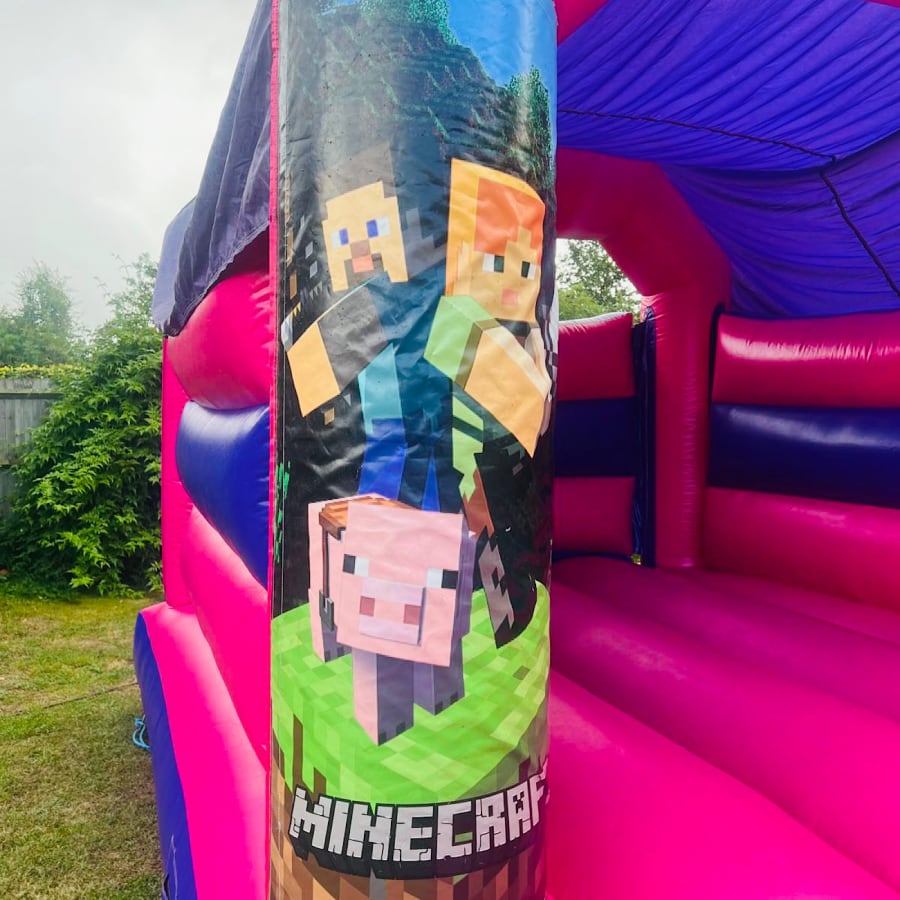 Meet Alex, Ari, Efe and the Dragon Slayer with this super cool Minecraft themed pink bouncy castle
