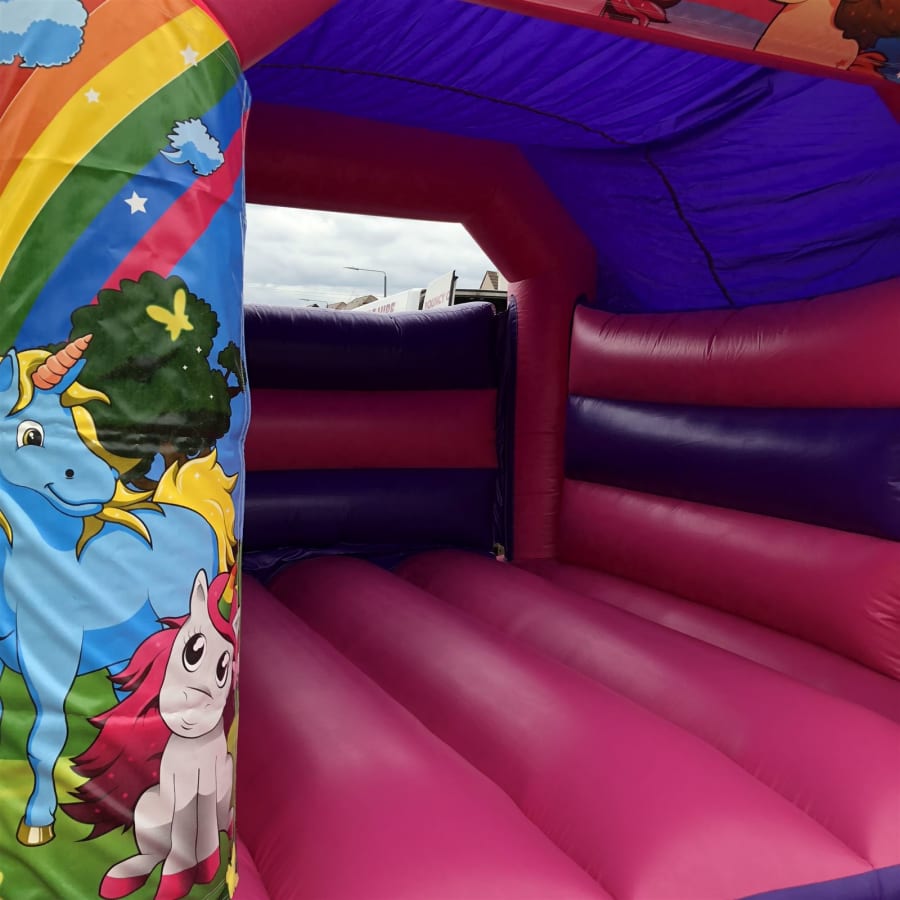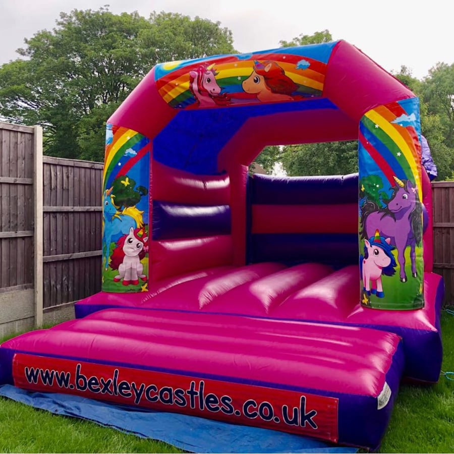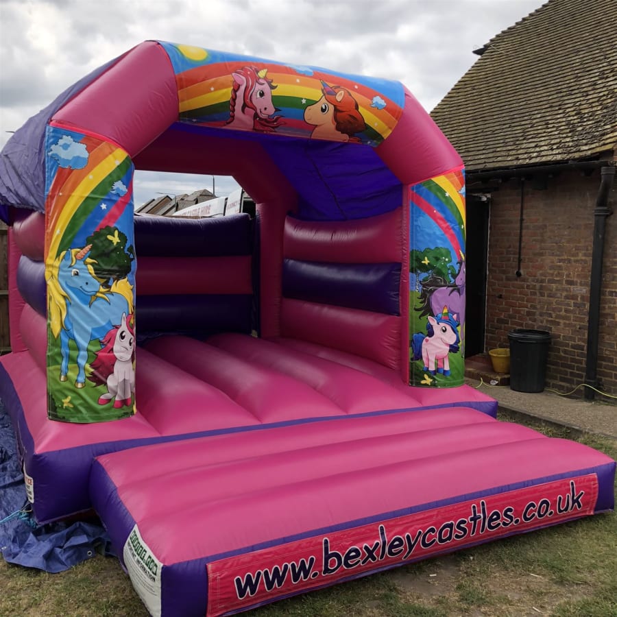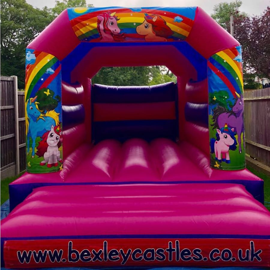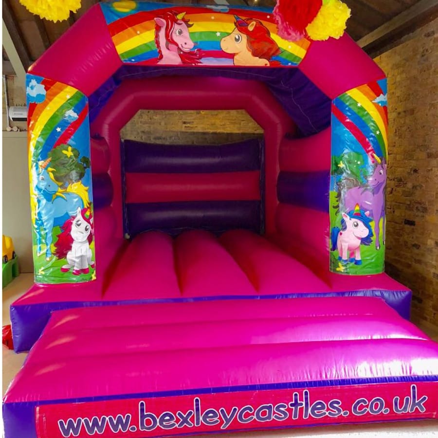 Book bouncy castle hire Unicorn Pink Bouncy Castle 12ft x 15ft x 10ft in bexley for a colourful, on-trend party attraction. Ideal for birthdays, family fun days, school events and neighbourhood parties. Bright unicorn and rainbow colours make this model one of our most requested themes. π