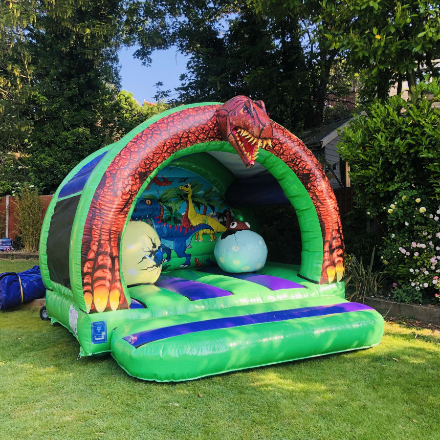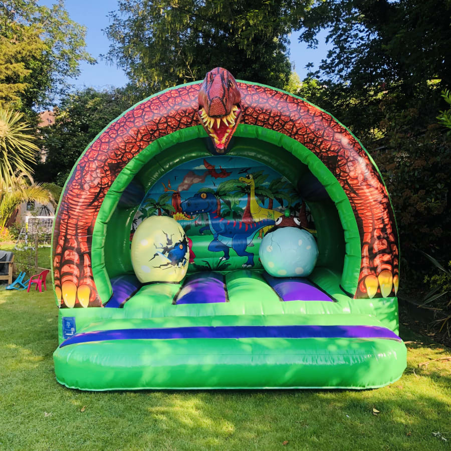 Deluxe dinosaur bouncy castle with rounded edges and a fantastic 3D dino head on top of the arch.