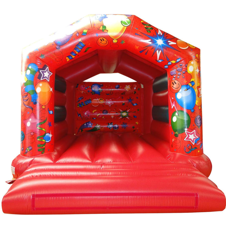 Here we have this premium adult bouncy castle in a celebration party theme on a red base. Although built to withstand the weight of adult users the inflatable makes a good choice for family events so everybody can join in the fun.