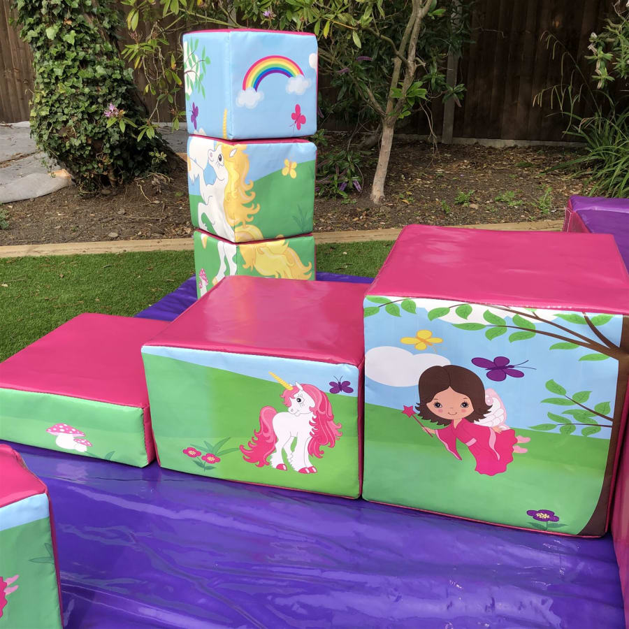 - 18 pieces of Unicorn themed soft play comprising of triangles, slopes, squares, steps, puzzle cubes and stepping stones.
