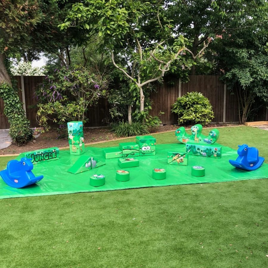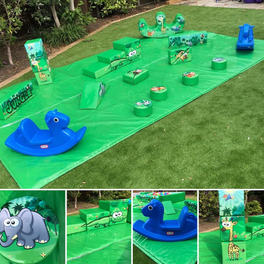 - 18 pieces of jungle themed soft play comprising of triangles, slopes, squares, steps, puzzle cubes and stepping stones.