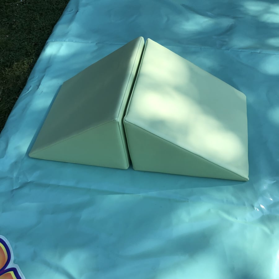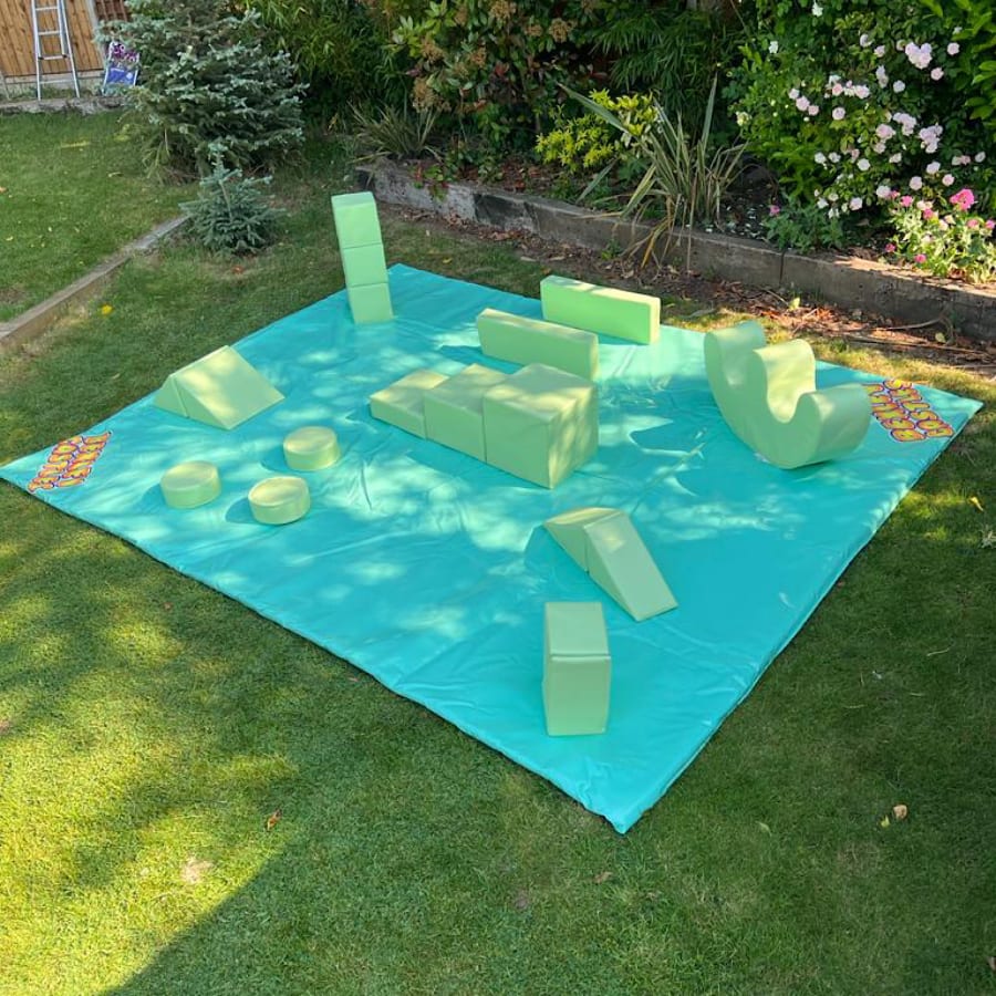 - 18 pieces of pastel mint soft play comprising of triangles, slopes, squares, steps, puzzle cubes and stepping stones.