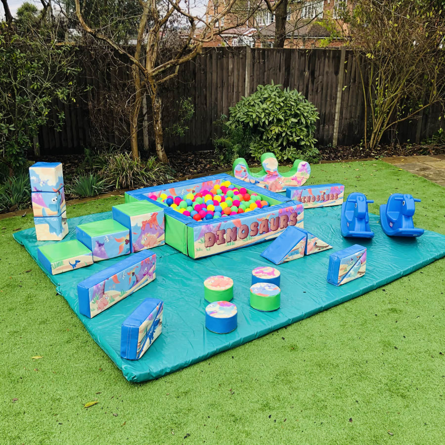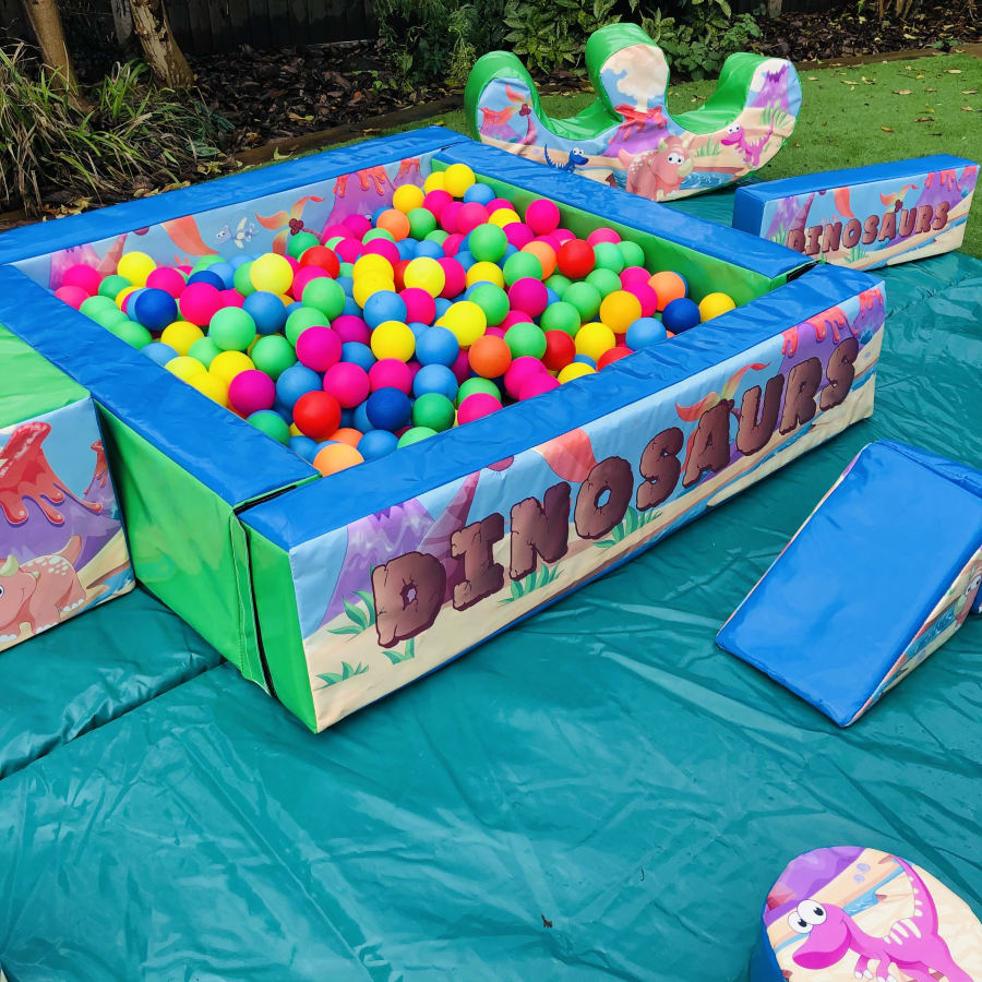 A standout brand new dinosaur soft play and ball pond set with detailed artwork: