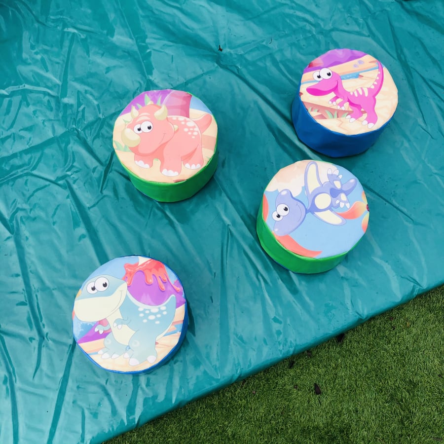 - 18 pieces of Dino themed soft play comprising of triangles, slopes, squares, steps, puzzle cubes and stepping stones.