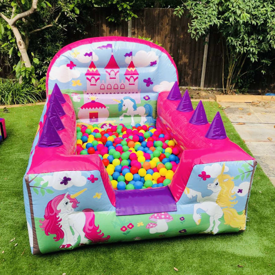 - Unicorn air juggler measuring 6ft W x 8ft L x 4ft H including 1000 play balls. (Small returnable deposit is taken on delivery for the balls)
