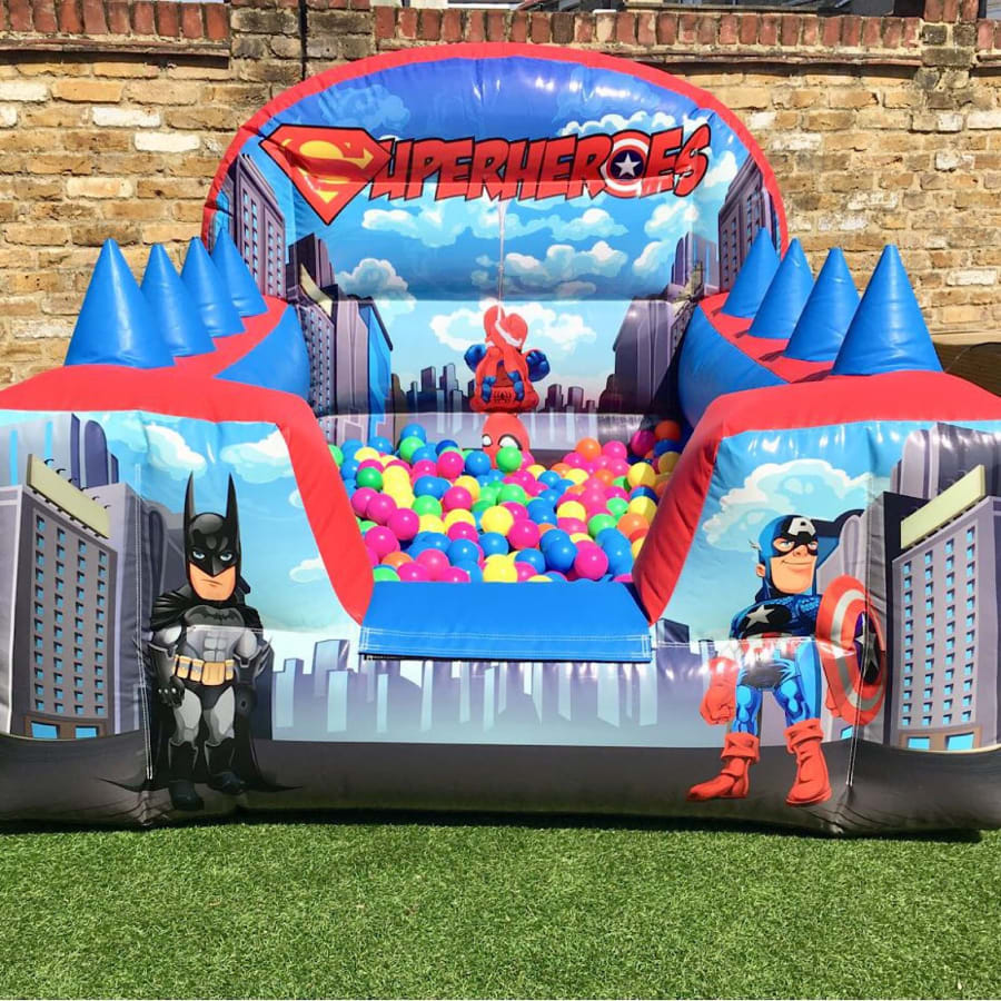 Superhero themed ball pond with 'floating balls' on either side and a deep filled ball pond to dive into.