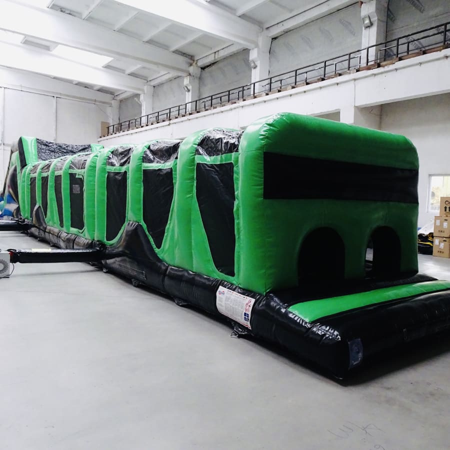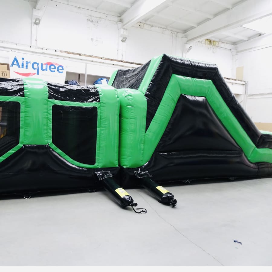 1. The 70ft endurance zone obstacle course. 12ft W x 70ft L x 12ft H, a longer challenging assault course with the following layout: Crawl through > Mangle > Letterbox > Mangle > Pop-up Jungle > Ladder Climb > Slide. Mats are provided on exit for landing.This item requires 3 blowers and will need respective access to electrical sockets. A fully enclosed assault course that provided hours of fun!