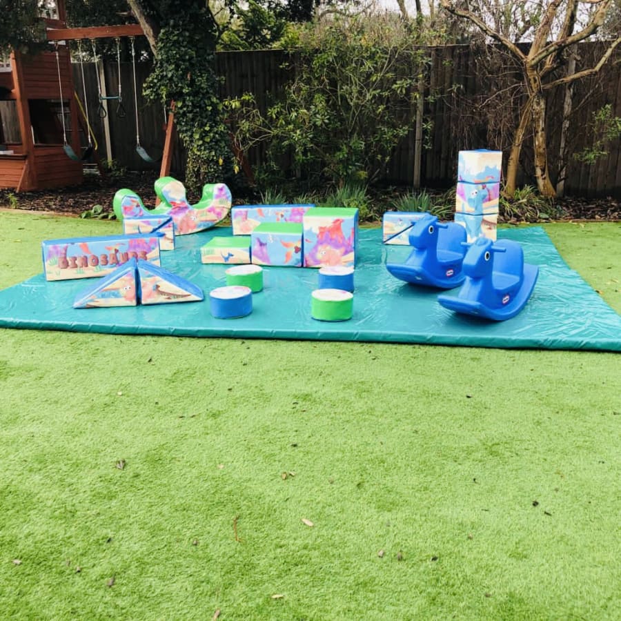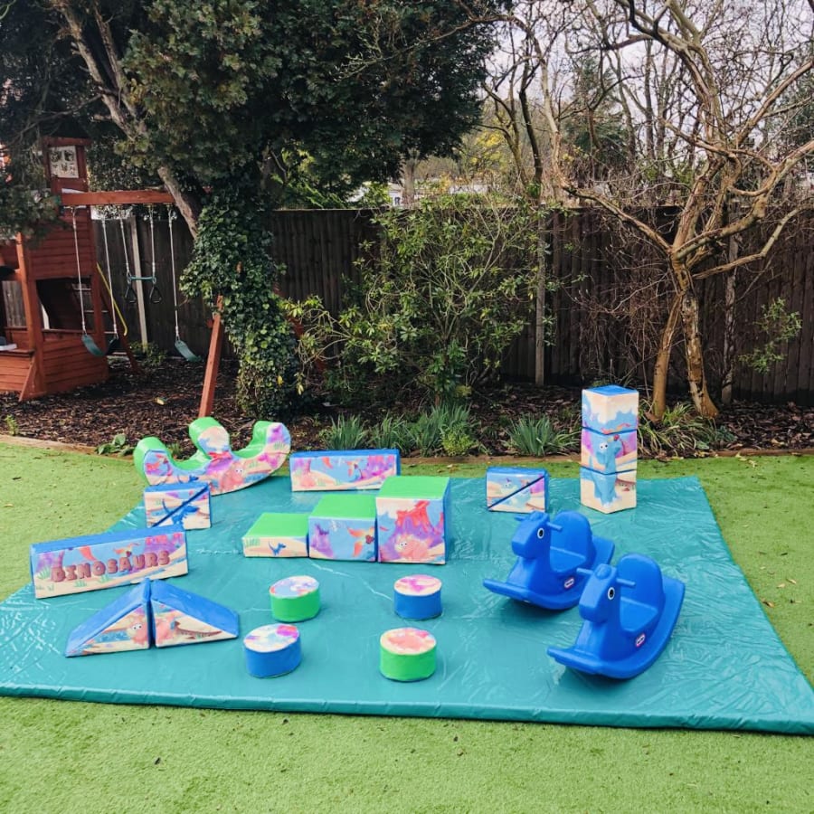 - 18 pieces of Dino themed soft play comprising of triangles, slopes, squares, steps, puzzle cubes and stepping stones.
